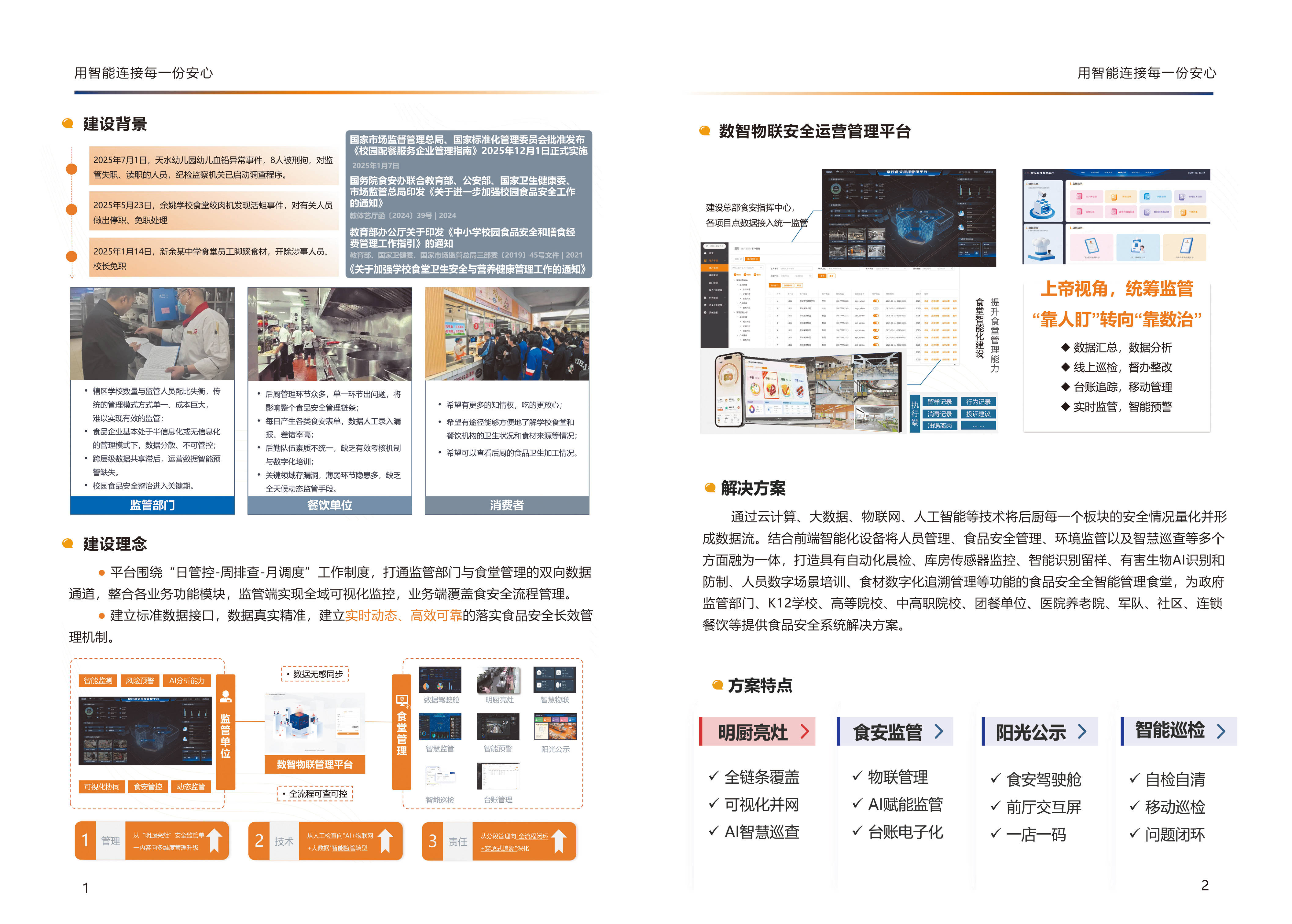 高校聪慧食安处理方案操纵先辈的物联网、大数据、人工智能等手艺,实现对食物从采购、加工到消费全过程的及时和办理。取保守办理模式比拟,其劣势显著。起首,提高监管效率。保守模式下,辖区学校数量取监管人员配比失衡,监管难度大。而聪慧食安处理方案能够实现数据的从动采集和阐发,大大减轻监管人员的工做承担,提高监管的精准度和及时性。其次,提拔食物平安保障程度。通过对食物供应链的全程逃溯,一旦呈现食物平安问题,能够快速定位问题泉源,采纳无效办法,保障师生的饮食平安。此外,聪慧食安处理方案还能够供给数据支撑,帮帮高校办理者制定科学合理的食物平安办理策略。